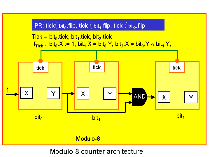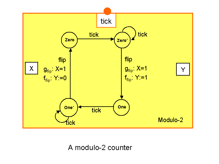 The application models a synchronous module-8 counter.  The modulo-8 counter is obtained by composition of three modulo-2 counters. The modulo-2 counter is an atomic component described schematically in the figure below. It has the variables X (treated as an input) and Y (treated as an output). The port flip corresponds to a singleton interaction, and the port tick is used for the global synchronous step.